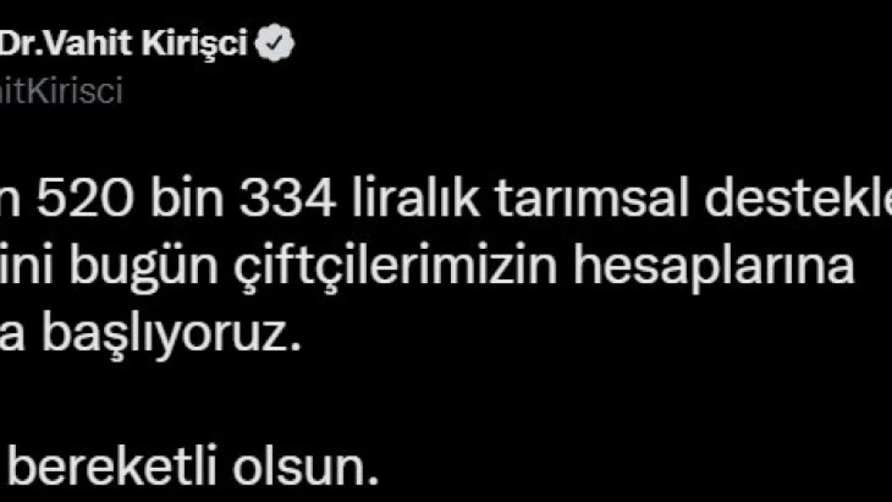 Tarım ve Orman Bakanı Prof. Dr. Vahit Kirişci, sosyal medya hesabından yaptığı paylaşımda, Hububat, Baklagiller ve Dane Mısır Desteği kapsamında 63 milyon 146 bin 94 lira, Alan Bazlı Verim Kaybı Desteği kapsamında 22 milyon 47 bin 669 lira, Hayvan Hastalıkları Tazminatı Desteği kapsamında 20 milyon 952 bin 504 lira ve Kırsal Kalkınma Desteği kapsamında 10 milyon 374 bin 67 liralık tarımsal destek ödemesinin bugün itibarıyla çiftçilerin hesaplarına aktarmaya başladıklarını açıkladı