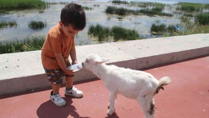 Konya'nın Beyşehir ilçesinde 2,5 yaşındaki Ömer, ailesinin kendisine arkadaş olsun diye aldığı 1 aylık oğlağı içi süt dolu biberonla besliyor.