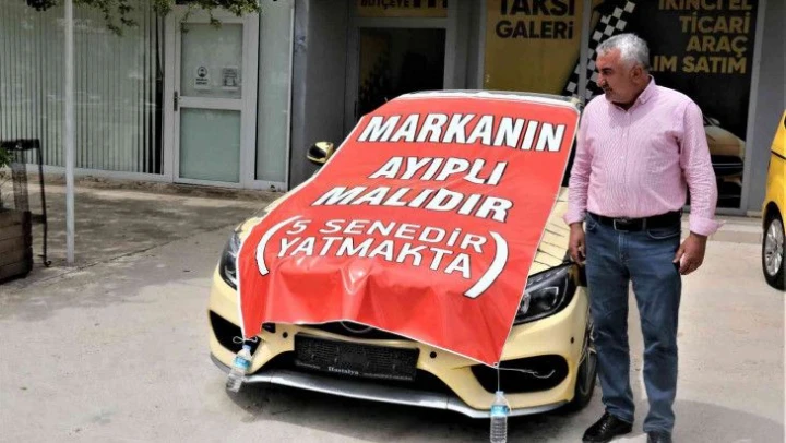 Aldığı lüks aracı işyerinin önüne koyup, üzerine 'Markanın ayıplı malıdır, 5 yıldır yatmakta' yazdı