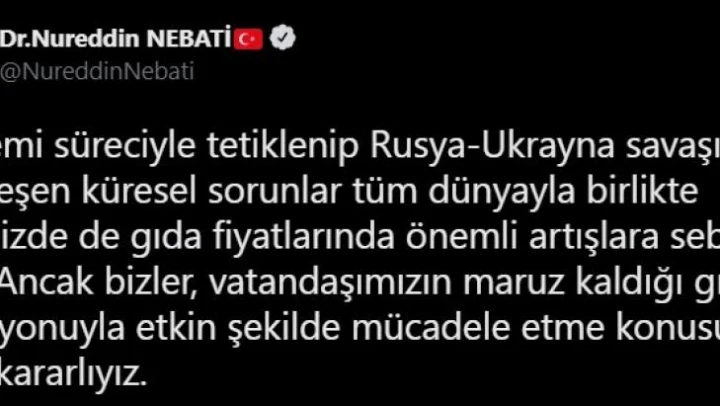 Hazine ve Maliye Bakanı Nureddin Nebati, yükselen gıda fiyatlarının enflasyon üzerine baskı oluşturmasına karşı alınan önlemlere ilişkin açıklama yaptı. Nebati, pandemi süreciyle tetiklenip Rusya-Ukrayna savaşıyla derinleşen küresel sorunların tüm dünyayla birlikte Türkiye'de de gıda fiyatlarında artışa sebep olduğunu belirterek, 'Ancak bizler, vatandaşımızın maruz kaldığı gıda enflasyonuyla etkin şekilde mücadele etme konusunda kesin kararlıyız' dedi.