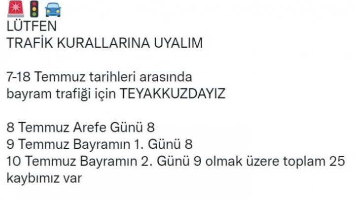 'Lütfen trafik kurallarına uyalım. 7-18 Temmuz tarihleri arasında bayram trafiği için teyakkuzdayız. 8 Temmuz arefe günü 8, 9 Temmuz bayramın 1. günü 8, 10 Temmuz bayramın 2. günü 9 olmak üzere toplam 25 kaybımız var. Emniyet kemerini ihmal etmeyelim. bayramınız kemerli olsun.'