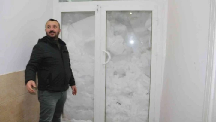 Bitlis'in Tatvan ilçesinde etkili olan kar yağışı ve çatıdan düşen kar kütleleri sonucu bir iş yerinin pencereleri ve kapıları kapanırken, iş yeri sahibi ise kürekle çıkış yolu aradı.