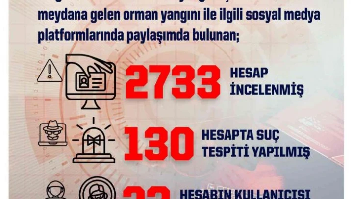 Jandarma Genel Komutanlığı tarafından Muğla'daki orman yangını hakkında sosyal medya üzerinden suç içerikli paylaşımlarda bulunan şahısların tespit edildiğine dair yapılan açıklamada, 'Jandarma Genel Komutanlığı Siber Suçlarla Mücadele Daire Başkanlığınca, Muğla'nın Marmaris ve Köyceğiz ilçelerinde meydana gelen orman yangını ile ilgili sosyal medya platformlarında paylaşımda bulunan 2 bin 733 hesap incelenmiş, 130 hesapta suç tespiti yapılmış, 23 hesabın kullanıcısı/yöneticisi tespit edilerek işlemlere başlanılmıştır' denildi.