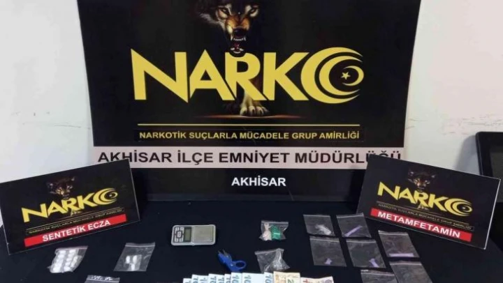 Manisa İl Emniyet Müdürlüğü Akhisar Narkotik Suçlarla Mücadele Grup Amirliği görevlilerince uyuşturucu veya uyarıcı madde ticareti yapan, nakleden ve kullanan şahıslara yönelik yapılan çalışmalarda Akhisar ilçesinde durdurulan bir araçta yapılan aramada; 7 parça halinde 3,57 gram metamfetamin maddesi, 17 adet sentetik ecza hapı, 1 adet hassas terazi, 1 adet uyuşturucu kullanmaya yarayan aparat, 2 adet ölçüm yapmaya yarayan aparat, 1 adet uyuşturucu paketlemede kullanılan makas ve uyuşturucu madde ticaretinden elde edildiği değerlendirilen bin 285 TL para ele geçirildi. Konuyla ilgili 2 şüpheli şahıs 'Uyuşturucu veya uyarıcı madde imal ve ticareti yapmak' suçundan gözaltına alınarak haklarında adli işlemlere başlandı.
