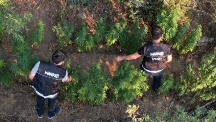 İzmir'in Ödemiş ilçesinde, polis ekiplerinin düzenlediği operasyonda Hint kenevirleri dron ile tespit edildi. Düzenlenen operasyonda, araziye ekilmiş 66 kök Hint keneviri ele geçirildi.