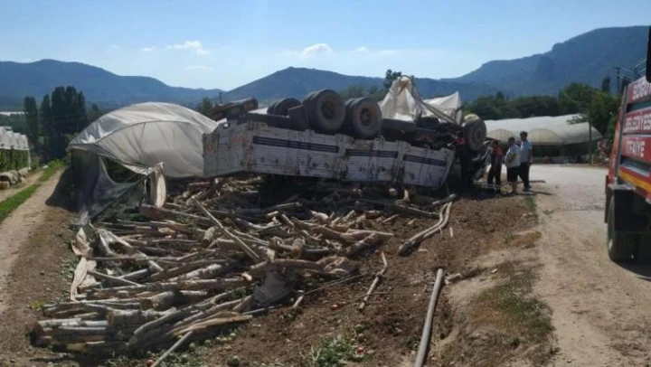 Odun yüklü kamyon seraya devrildi: 2 yaralı