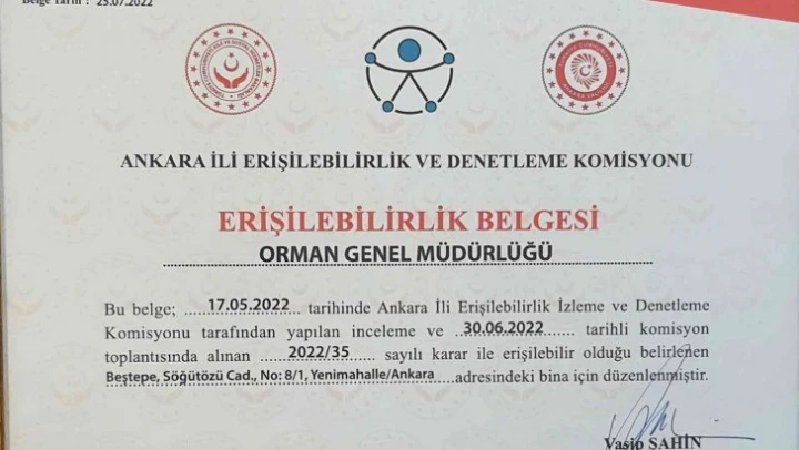 Tarım ve Orman Bakanlığı Orman Genel Müdürlüğünün Yenimahalle ilçesi Beştepe semtindeki Söğütözü Caddesi üzerinde bulunan merkez binasına 'Erişilebilirlik Belgesi' verildi. Binada Ankara Erişilebilirlik ve Denetleme Komisyonu tarafından 17 Mayıs'ta inceleme yapıldı. Komisyonun 30 Haziran'da yaptığı toplantıda da söz konusu binanın bu belgenin düzenlenmesi için gerekli şartları taşıdığı tespit edilerek, 'Erişilebilirlik Belgesi' düzenlenmesine karar verildi. Başkent'te ilk kez bir kamu kurumu için düzenlenen ve Ankara Valisi Vasip Şahin'in imzasını taşıyan 'Erişilebilirlik Belgesi' Genel Müdürlüğe tevdi edildi.