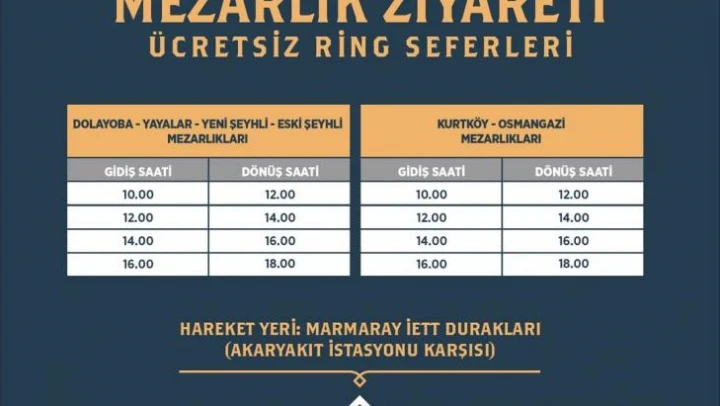 Pendik Belediyesi Kurban Bayramı dolayısıyla ilçe genelindeki mezarlıklara ring servisi düzenliyor. Mezarlıkları ziyaret etmek isteyen vatandaşlar Arefe Günü'nde Marmaray İETT durakları önünden kalkacak ringlerle mezarlıklara gidebilecek. Ücretsiz olan bu hizmetle vatandaşlara Dolayoba, Yayalar, Yeni Şehli, Eski Şeyhli, Kurtköy ve Osmangazi Mezarlıklarına kolay ve ücretsiz ulaşım sağlanacak.