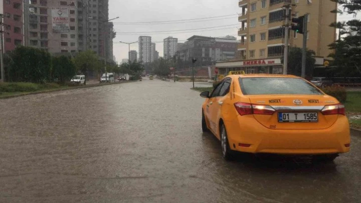 Adana'da birden başlayan sağanak yağış yolların nehre dönüşmesine neden olurken, araçlar yollarda kaldı.