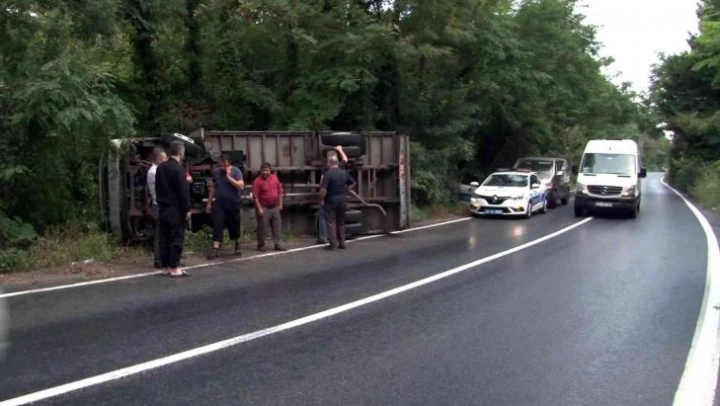 Sarıyer'de yağıştan dolayı kayganlaşan yolda sürücüsünün direksiyon hakimiyetini kaybetmesi sonucu kamyon devrildi. Olayda ölen veya yaralanan olmazken kamyonda maddi hasar meydana geldi.