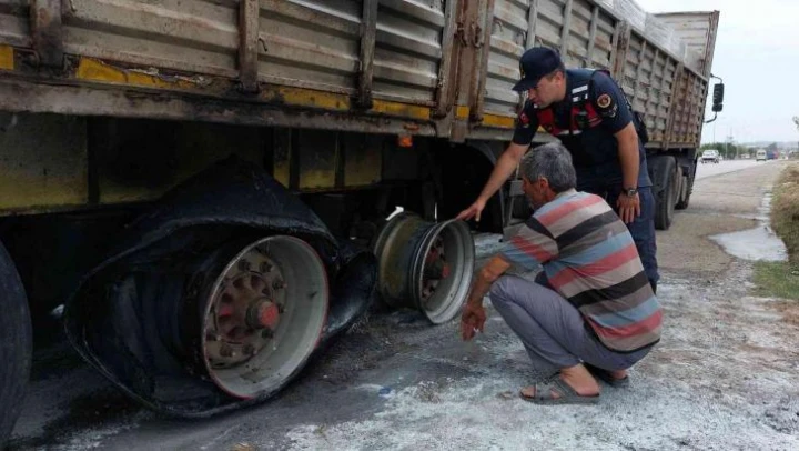 Samsun'da seyir halindeki tırın lastikleri patlayarak alev aldı. Yangın, vatandaşların müdahalesi ile büyümeden söndürüldü.