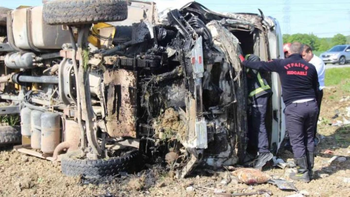 Kocaeli'de su kanalına çarparak devrilen hafriyat kamyonunun sürücüsü hayatını kaybetti.