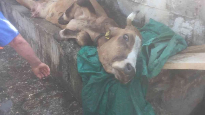 Su oluğuna sıkışan ineği köylüler kurtardı
