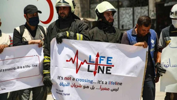 Türkiye-Suriye sınırında yer alan Bab el-Hava Sınır Kapısı'nda toplanan onlarca kişi, Türkiye üzerinden Suriyeli mültecilere yapılan yardımların kesintisiz şekilde devam etmesi için sınır kapısının açık kalması amacıyla protesto gösterisi düzenledi.