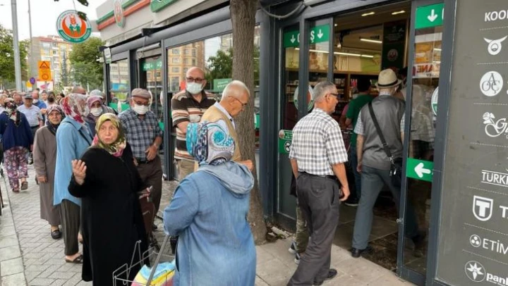 Eskişehir'de Tarım Kredi Kooperatif Marketi önünde indirimli ürünler için günün erken saatlerinde uzun kuyruklar oluşurken, vatandaşlar arasında zaman zaman sıra tartışmaları yaşandı.
