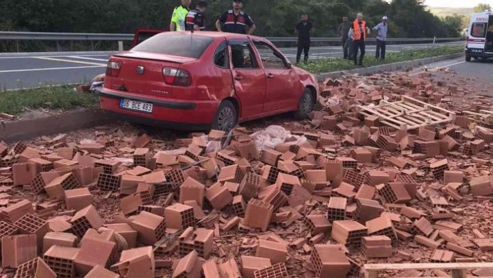 Tır dorsesindeki tuğlalar otomobilin üzerine düştü: 3 yaralı