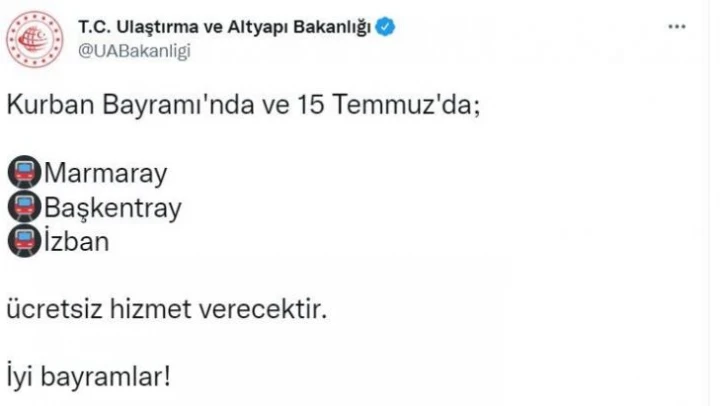 Ulaştırma ve Altyapı Bakanlığı; Ankara, İzmir ve İstanbul'da hizmet veren raylı ulaşım sistemlerinin Kurban Bayramı'nda ve 15 Temmuz Demokrasi ve Milli Birlik Günü'nde ücretsiz hizmet vereceğini duyurdu. Bakanlığın sosyal medya hesabından yapılan açıklamada, “Kurban Bayramı'nda ve 15 Temmuz'da; Marmaray, Başkentray ve İzban ücretsiz hizmet verecektir” ifadelerine yer verildi.