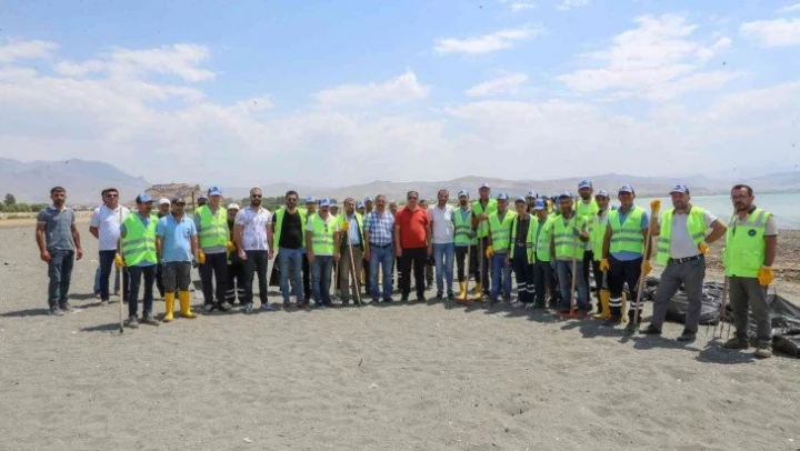 Van'ın İpekyolu Belediyesi ekiplerince Van Gölü sahilinde yürütülen temizlik çalışmasında tonlarca çöp toplandı.