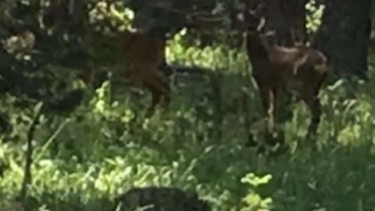 Kars'ın Sarıkamış ilçesinde ormanlık alanda gezinen anne ve yavru karaca vatandaş tarafından cep telefonuyla görüntülendi.
