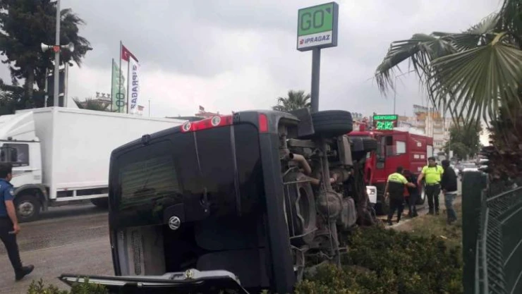 Antalya'nın Serik ilçesinde refüjdeki palmiyelere çarparak devrilen lüks minibüsün sürücüsü yaralandı.