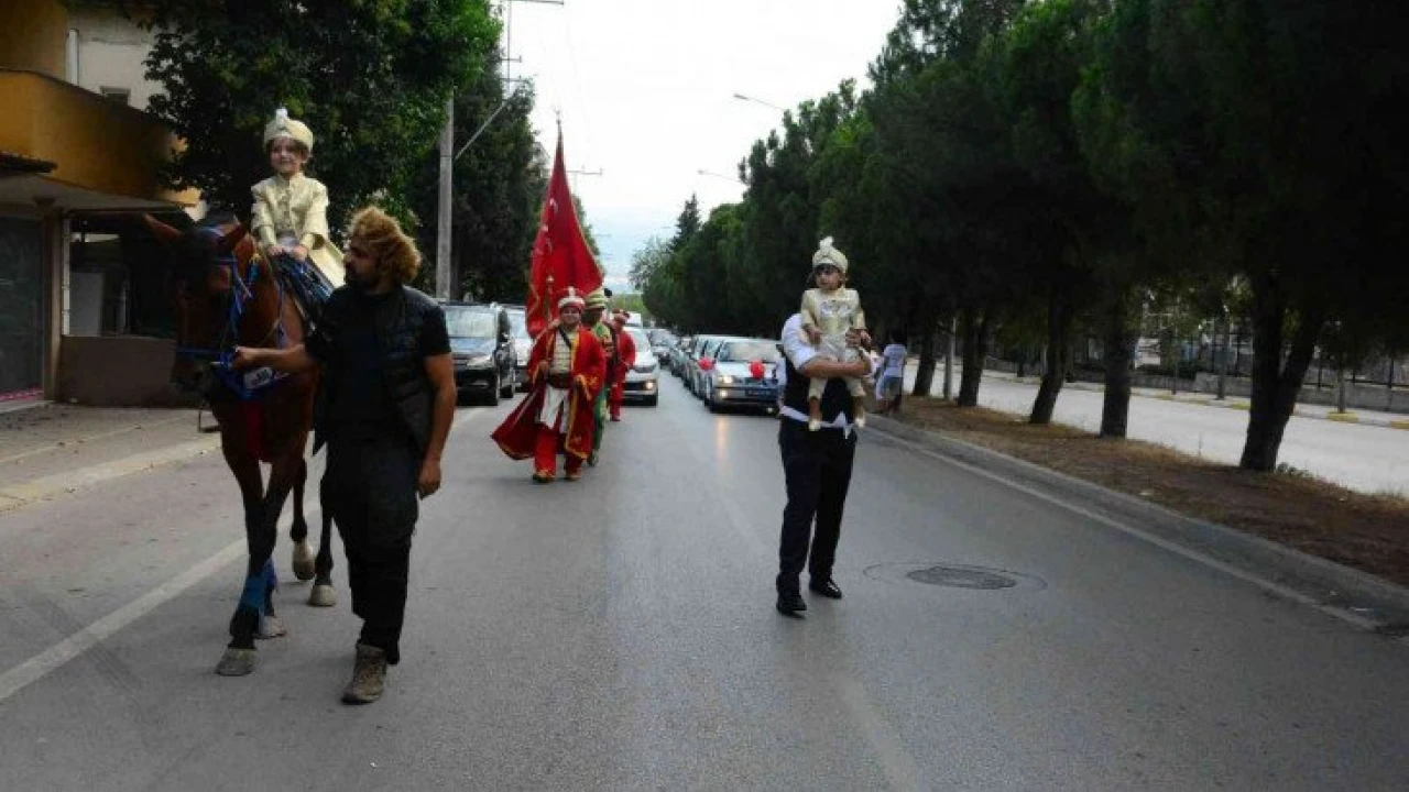 Kocaeli'de polis memuru baba 2 çocuğu için atlı ve mehter takımlı sünnet cemiyeti düzenledi.