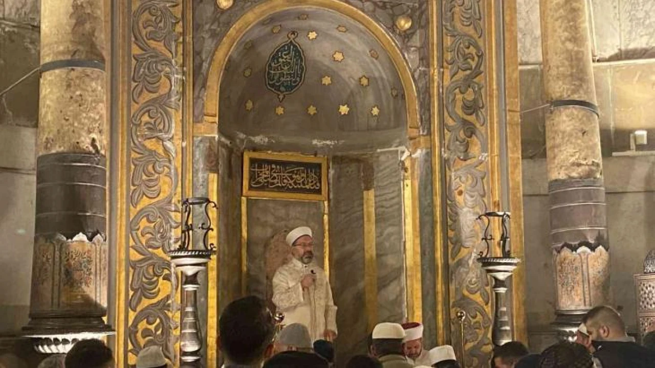“Birlikte, fethin emaneti Ayasofya-i Kebir Cami-i Şerif’inde sabah namazımızı kıldık. Fethin 569. Seneyi devriyesinde ve fetihle birlikte camiye dönüştürülen Ayasofya’da beraber olmak, birlikte secde etmek çok anlamlı. Allah kabul etsin. Cenab-ı Hakk, fethi nasıl 569 sene önce bu ümmete bu millete nasip ettiyse bundan sonra da gönüllerimizi rabbimizin mağfiretine açsın inşallah. Ayeti kerime de Rabbimiz buyuruyor ki, “Rabbinizden mağfirete koşunuz, netice itibarıyla o mağfireti elde ettikten sonra Cenab-ı Hakk’ın size müjdelediği cennete koşunuz. O cennetin genişliği gökler ve yer kadardır. Müttekıler için hazırlanmıştır. Müttekı olmanın yolu işte camiden geçiyor. Rükudan, secdeden geçiyor. Cenab-ı Hakkın emirlerine riayet etmekten yasaklarına uymaktan geçiyor. İşte bu ayetler, Mekke-i mükerremede medine’yi münevverede Allah Rasulü Hz. Muhammed Mustafa Efendimize geldiğinde ve bu ayetleri efendimizin etrafındaki insanlar mü’minler dinlediğinde hiç beklemeden, düşünmeden mağfirete koştular.