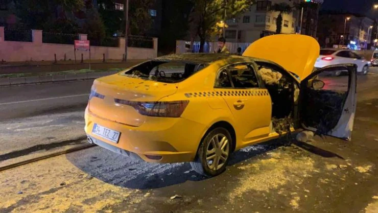 Bahçelievler'de içinde yolcu bulunan ticari taksi seyir halindeyken motor kısmından alev alarak yanmaya başladı. Sürücü aracı durdurup yolcuyla birlikte kendisini kurtarırken, alevlere teslim olan taksi kullanılamaz hale geldi.