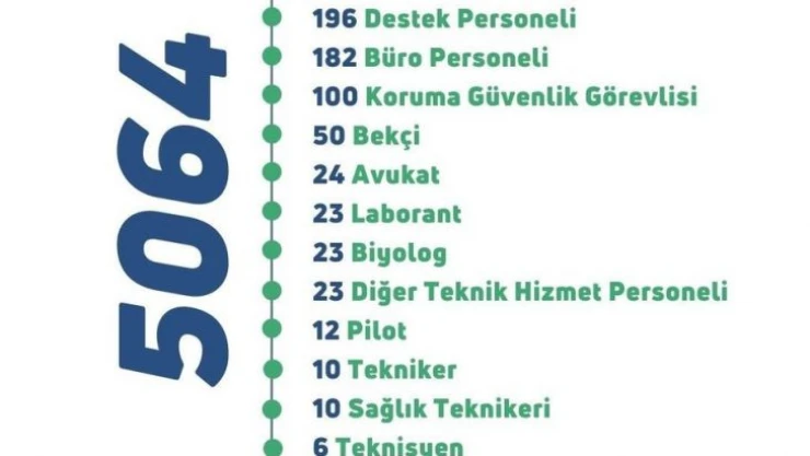 Bakan Kirişci’nin yaptığı paylaşımda yer verilen infografiğe göre bakanlığa, 2 bin 560 Orman Muhafaza Memuru, bin 447 Mühendis, 392 Veteriner Hekim, 196 Destek Personeli, 182 Büro Personeli, 100 koruma Güvenlik Görevlisi, 50 Bekçi, 24 Avukat, 23 Laborant, 23 Biyolog, 23 Diğer Teknik Hizmet Personeli, 12 Pilot, 10 Tekniker, 10 Sağlık Teknikeri, 6 Teknisyen ve 6 Helikopter Makinisti alınacak.