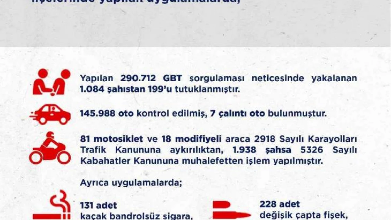 Uygulamada 131 adet kaçak sigara, 28 adet kurusıkı tabanca, 46 adet ruhsatsız tabanca, 2 adet ruhsatlı tabanca, 228 adet değişik çapta fişek, 20 adet belgesiz av tüfeği, 2 adet belgeli av tüfeği, 32 adet kesici ve delici alete el konuldu.