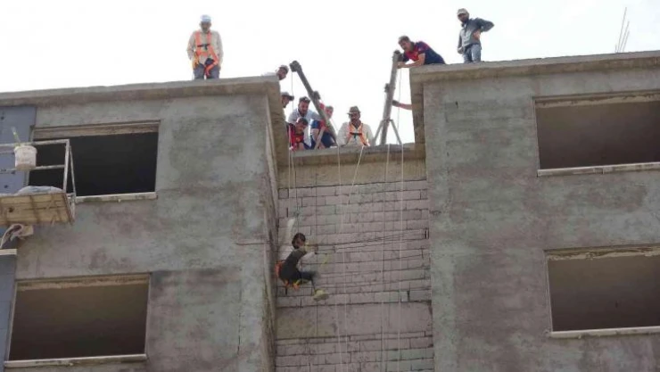 Edinilen bilgilere göre, Yeni Mahalle 26399 Sokak içerisinde bulunan ve yapımı devam eden 9 katlı bir binanın 7.katında çalışan İdris Koç’un üzerinde bulunduğu iskele aniden çöktü. Havada asılı kalan İdris Koç, ölüm kalım mücadelesi verdi. Durumu fark eden inşaat çalışanları ile vatandaşlar itfaiye ekiplerine haber vererek yardım istedi. Kısa sürede olay yerine gelen itfaiye ekipleri, kurtarma çalışması başlattı. Dakikalarca süren kurtarma çalışmaları sonucunda İnşaat işçisi İdris Koç, kendisine uzatılan halatları kendisine bağladı. Halat yardımıyla yukarı çıkarılan İdris Koç, sağ salim kurtarıldı.