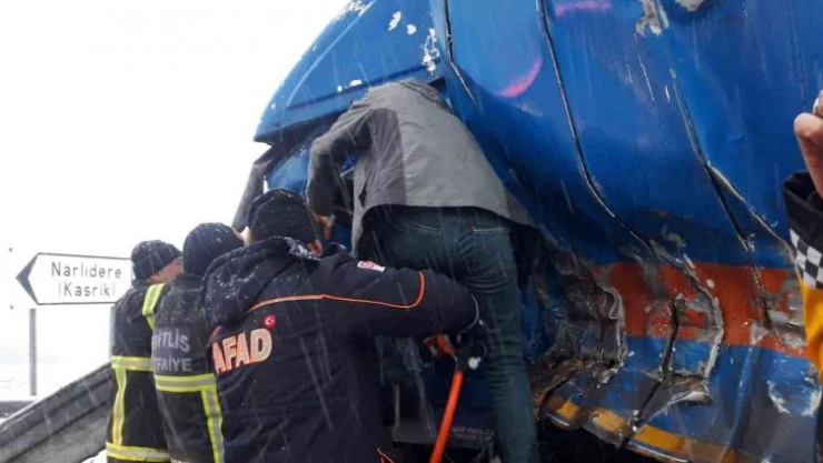 Kaza, Bitlis-Baykan karayolundaki Narlı Dere mevkiinde meydana geldi. Edinilen bilgiye göre, yoğun kar yağışı ve tipi nedeniyle MNG kargo firmasına ait kamyonla tır yolda çarpıştı. Çarpışmanın etkisiyle tır şarampole yuvarlanmaktan kıl payı kurtulurken kamyon şoförü araçta sıkışarak ağır yaralandı. Durumun bildirilmesi üzerine olay yerine sağlık, jandarma, itfaiye ve AFAD ekipleri sevk edildi. Afet ve Acil Durum Bitlis İl Müdürlüğü (AFAD) ile Bitlis Belediyesine ait itfaiye ekipleri kazaya müdahale ederek kamyon şoförünü sıkıştığı yerden çıkardı. Ağır yaralanan ve ismi öğrenilemeyen kamyon şoförü yapılan ilk müdahalenin ardından Bitlis Devlet Hastanesi’ne kaldırılarak tedavi altına alındı.
