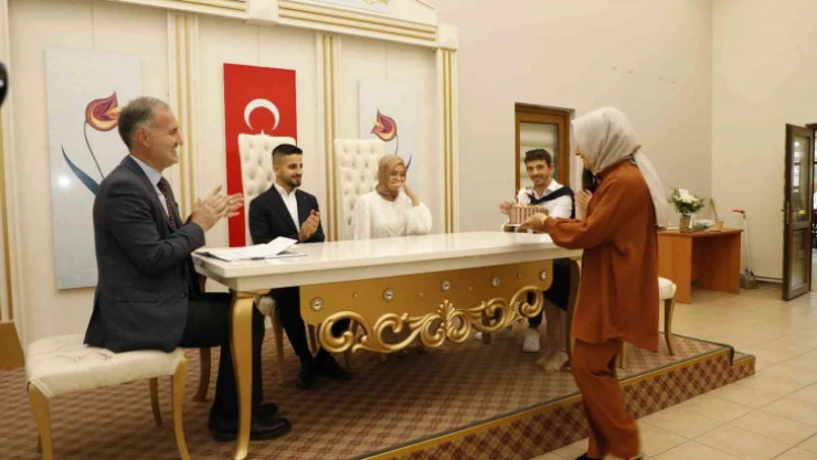 İnegöl’de dünya evine girmek için nikah günü alan Nisa Zehir ve Yusuf Demir çifti, bu özel günü daha da anlamlı kılmak adına gelinin doğum günü olan 12 Eylül tarihini seçti. Çiftin yakınları, nikah öncesi Belediye Başkanı Alper Taban’a sosyal medya üzerinden ulaşarak gelinin doğum günü olduğunu belirtip sürpriz olarak nikahı kıymasını istediler.