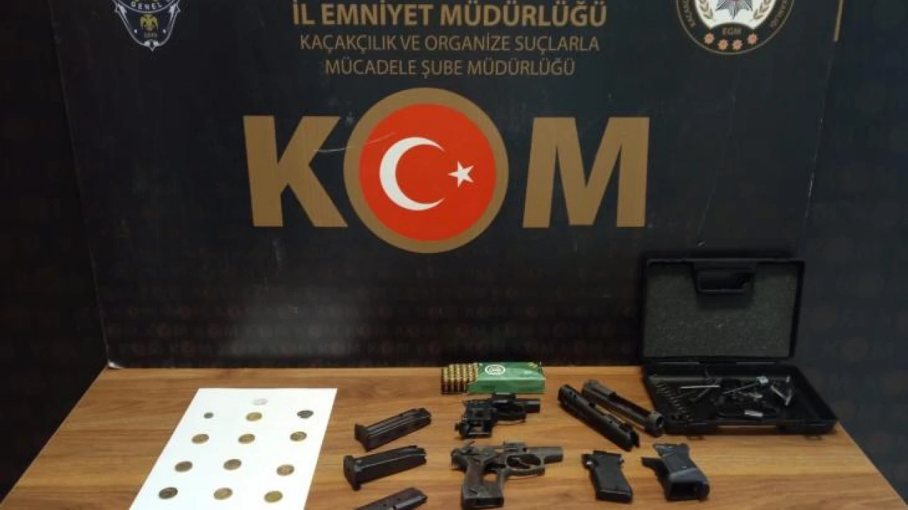 Çanakkale İl Emniyet Müdürlüğü Kaçakçılıkla Mücadele Şube Müdürlüğü (KOM) ekipleri tarafından tarihi eser kaçakçılığıyla mücadele çerçevesinde şüpheli K.Ç.’nin evinde yapılan aramada, tarihi eser olduğu değerlendirilen, Fatih Sultan Mehmet dönemine ait üzerinde şekiller bulunan sikke, üzerinde figür bulunan sikke, sarı renkli üzerinde tuğra bulunan sikke, beyaz taş obje, 6,35 çapında tabanca ve şarjörüne basılı vaziyette 4 adet fişek, 3 adet 9,19 çapında ve 1 adet 7,65 çapında fişek, 2 adet tabanca tetik mekanizma kısmı, 2 adet namlu, 3 adet farklı çaplarda şarjör, 2 adet tabanca sürgü kısmı, siyah tabanca kutusu içinde muhtelif kuru sıkı silah parçaları, 49 adet kuru sıkı tabancaya ait fişek ele geçirilerek el konuldu. Şüpheli K.Ç. hakkında 2863 ve 6136 Sayılı Kanuna Muhalefet suçundan adli işlem yapıldı