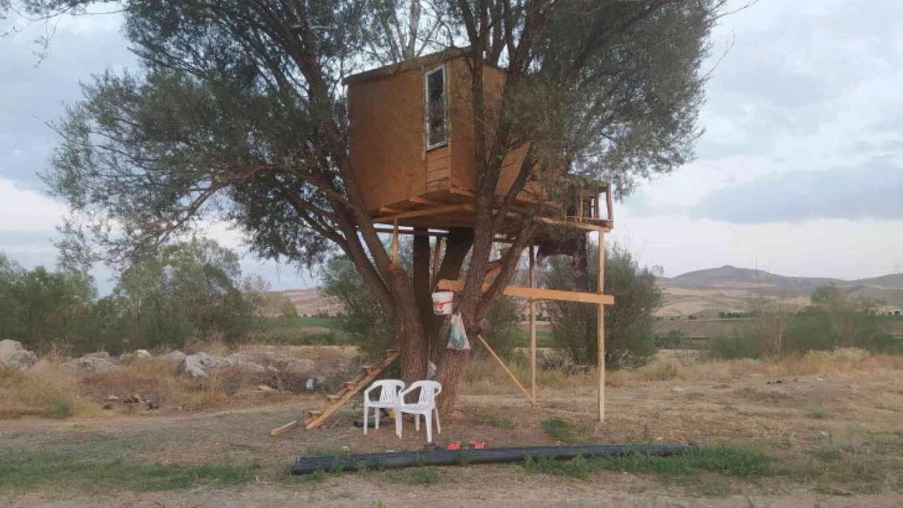 Sivas’ın Gemerek ilçesinde çobanların geceleri güvenle barınması için ağaca yapılan ev dikkat çekiyor.