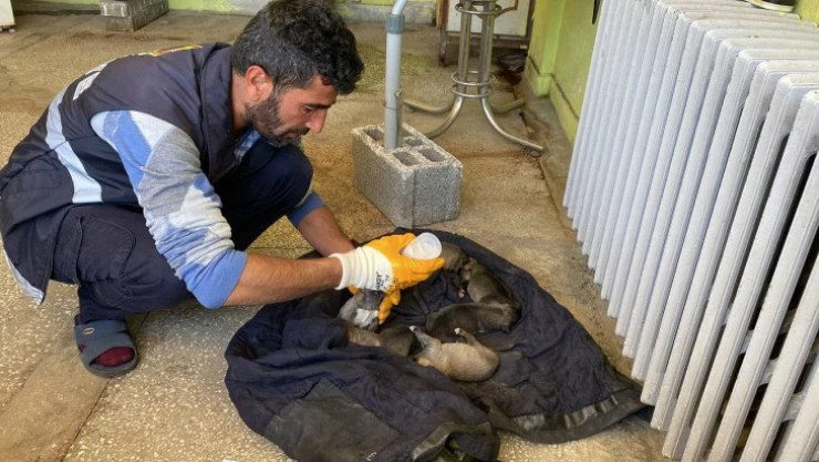 Bingöl'ün Karlıova ilçesinde bir vatandaşın ihbarı üzerine hareket eden itfaiye ekipleri, çöp konteynerinin yanında kutu içinde buldukları yavru köpekleri müdürlüğe getirerek biberonla besledi.