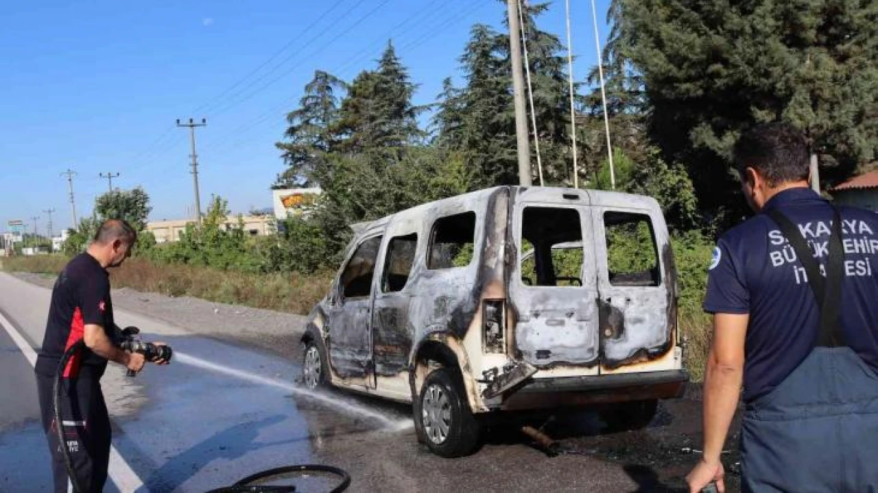 Sakarya'nın Erenler ilçesi D-100 karayolunda alevlere teslim olan hafif ticari araç, itfaiye ekiplerince söndürüldü. Meydana gelen yangın sonrasında araçtan geriye sadece demir yığınları kaldı.