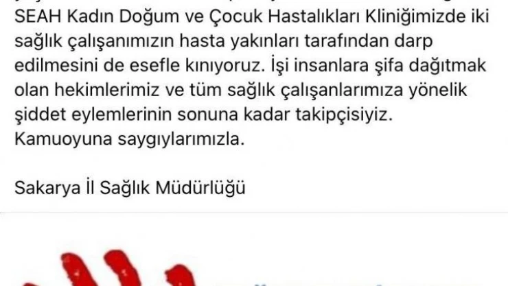 Sağlık çalışanlarının darp edilmesine ilişkin Sakarya İl Sağlık Müdürlüğünün sosyal medya hesabından yapılan yazılı açıklamada, “Son günlerde hekimlerimize ve sağlık çalışanlarımıza yönelik sebebi ne olursa olsun asla kabul edemeyeceğimiz sözlü ve fiili şiddet olaylarının yaşanmasını üzülerek takip ediyoruz. Son olarak SEAH Kadın Doğum ve Çocuk Hastalıkları Kliniğimizde iki sağlık çalışanımızın hasta yakınları tarafından darp edilmesini de esefle kınıyoruz. İşi insanlara şifa dağıtmak olan hekimlerimiz ve tüm sağlık çalışanlarımıza yönelik şiddet eylemlerinin sonuna kadar takipçisiyiz” ifadelerine yer verildi.