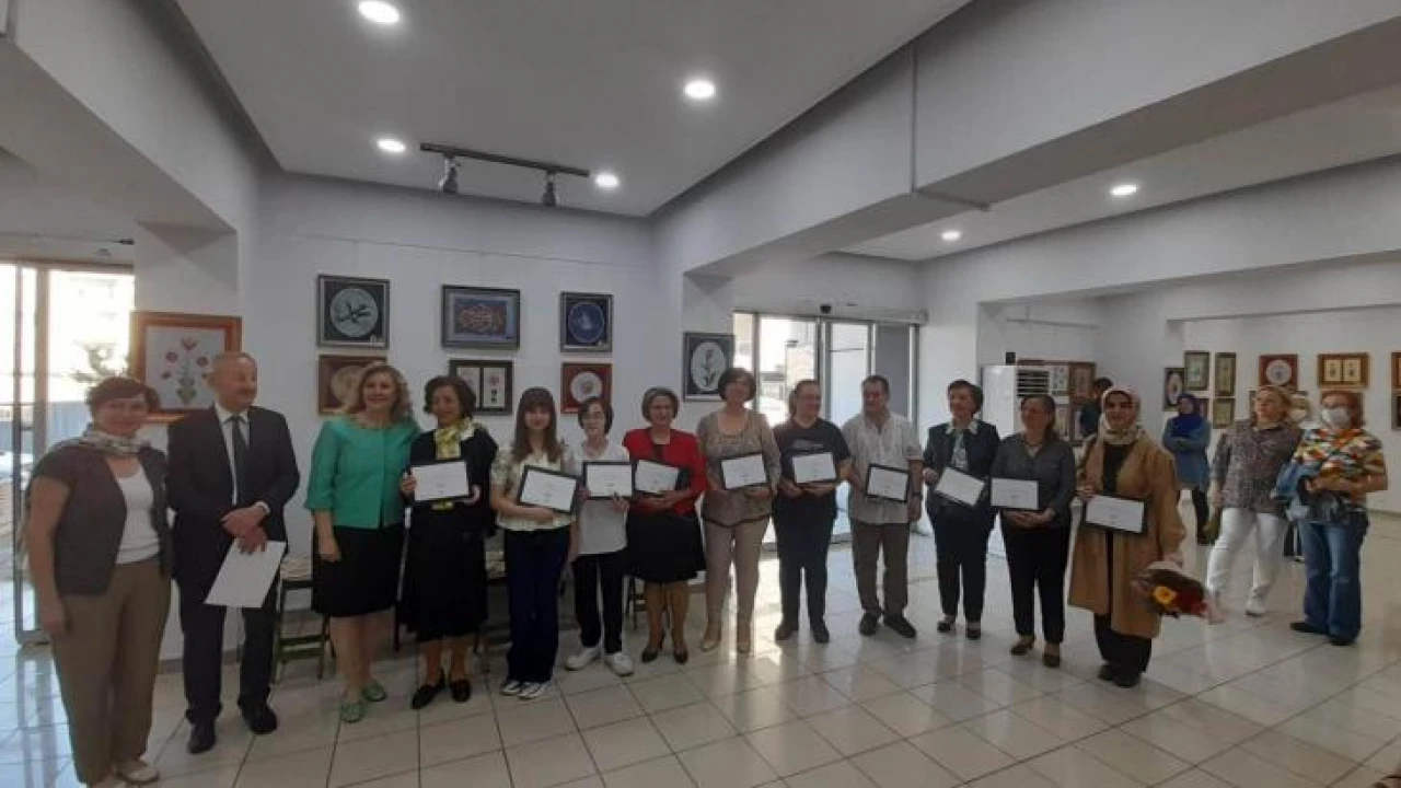 Nilüfer Belediyesi'nin düzenlediği Ebru Atölyesi'ne katılan kursiyerlerin, eğitim dönemi boyunca yaptığı çalışmalar Konak Kültürevi'nde düzenlenen sergide sanatseverlerle buluştu.