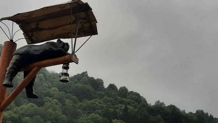 Rize’nin Hemşin ilçesine bağlı Çamlıtepe Mahallesi’nde yaşayan Sezai yüce, evinin önünde bulunan direğin üzerinde yaptığı yatan ayı heykeli ile ilgi odağı oldu. Evinin önündeki direğe uzanan ayı maketi yaptıran Yüce Rize’ye gelenlerin Rizelilerin hayvanlarla iç içe olduğunu anlatmak istediğini ifade etti.
