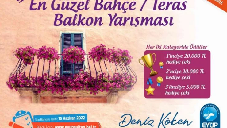 Eyüpsultan Belediyesi’nin “En Güzel Bahçe-Teras ve Balkon Yarışması” olarak iki ayrı kategoride düzenlediği yarışmada büyük bir özenle hazırlanmış birbirinden güzel ve renkli bahçe, balkon ve teraslar yarışacak. Çevre sevgisini arttırmak ve çevreye karşı vatandaşların duyarlılık bilincini desteklemek amacıyla düzenlenen yarışmada, her yarışmacı yalnızca bir kategoride yarışmaya katılım sağlayabilecek ve başvuru yapan herkes yarışmaya katıldığı mekânı yarışma sonuna kadar başvurduğu şekilde muhafaza etmeye özen gösterecek. Yarışmada her iki kategoride birincilere ödül olarak 20 bin TL hediye çeki, ikincilere 10 bin TL hediye çeki, üçüncülere ise 5 bin TL hediye çeki verilecek. Yarışmaya son başvuru tarihi 15 Haziran Çarşamba günü olacak. Sonuçlar ise 17 Haziran tarihinde açıklanacak.