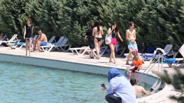 Bolu'da, eyyam-ı bahur sıcaklarında denize gidemeyen vatandaşlar sıcak havalarda serinlemek için 'Bolu'nun Pamukkalesi' olarak bilinen Akkayalar Travertenleri'ne akın etti.