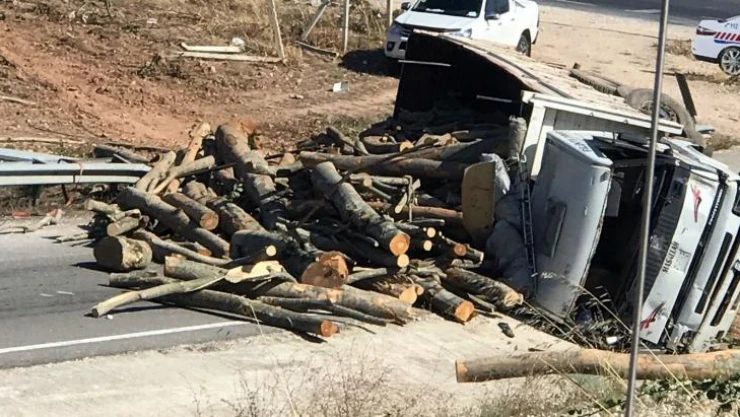Freni boşalan tomruk yüklü kamyon devrildi: 1 yaralı