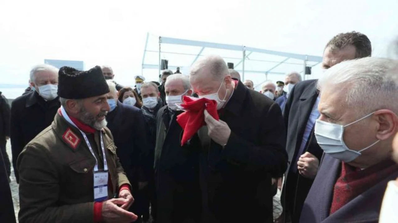 Çanakkale Deniz Zaferi’nin 107. yıl dönümü dolayısıyla Esenler’den yola çıkıp yürüyerek 10 günde Çanakkale’ye ulaşan gazi torunu Saffet Gümüş, al bayrağı Cumhurbaşkanı Recep Tayyip Erdoğan’a teslim etti.