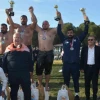 Başpehlivanlığı kazanan Recep Kara ile Fatih Atlı ile Ertuğrul Dağdelen’e ödüllerini Gömeç Belediye Başkanı Mehmet İrem Himam ile Balıkesir Büyükşehir Belediye Başkan Vekili Birol Şahin takdim etti.