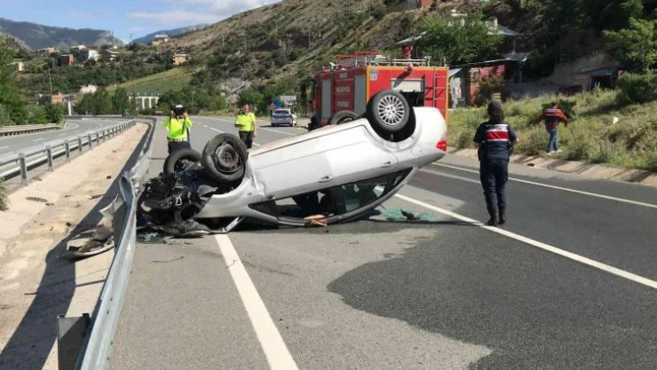 Gümüşhane'de lastiği patlayan otomobil önce duvara, sonra refüjdeki bariyerlere çarparak takla attı. Kazada biri ağır 2 kişi yaralandı.