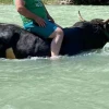 Artvin'in Yusufeli ilçesinde boğa tutkunu şahıs güreşlere hazırladığı 600 kilogramlık boğasını idmandan sonra serinlemesi için Çoruh nehrinde yıkıyor.