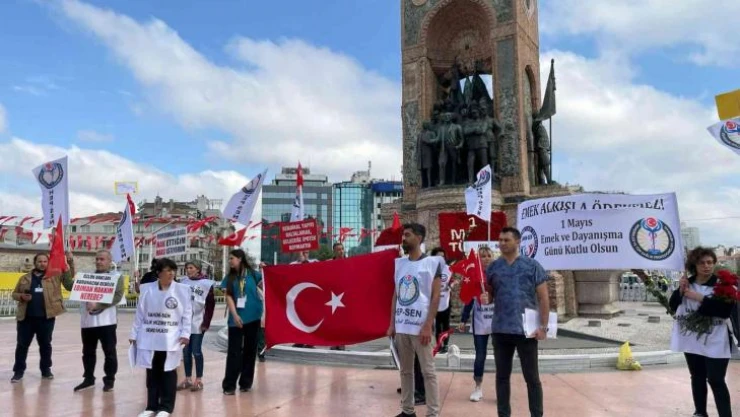 Hemşireler ve Tüm Sağlık Profesyonelleri Sendikası (Hep-Sen) ile Sağlık Hizmetleri Sendikası (Sahim-Sen) üyeleri, 1 Mayıs Emek ve Dayanışma Günü'nde Taksim Meydanı'ndaki Cumhuriyet Anıtı'na çelenk bıraktı.