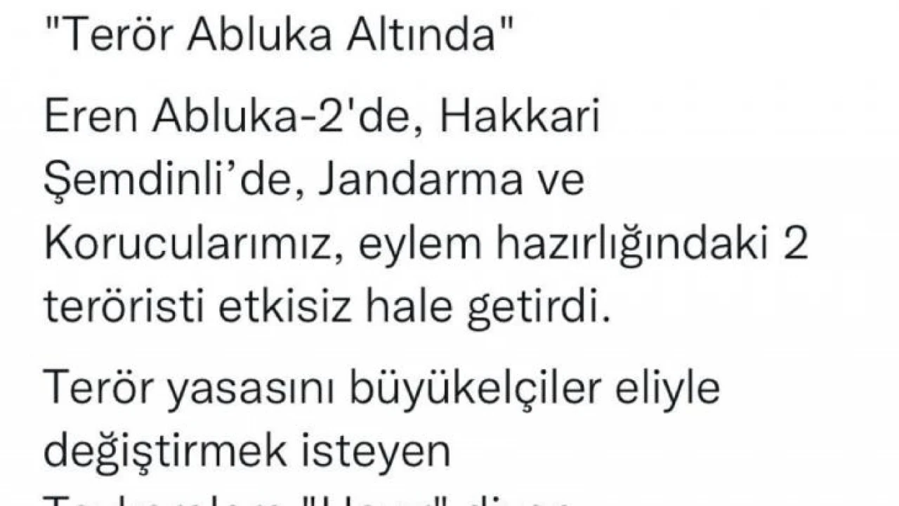 İçişleri Bakanı Soylu: "Terör abluka altında, Eren Abluka-2’de, Hakkari Şemdinli’de, Jandarma ve Korucularımız, eylem hazırlığındaki 2 teröristi etkisiz hale getirdi. Terör yasasını büyükelçiler eliyle değiştirmek isteyen, Tezkerelere "Hayır" diyen, Belediyelere terörist alan Kılıçdaroğlu’na duyurulur."