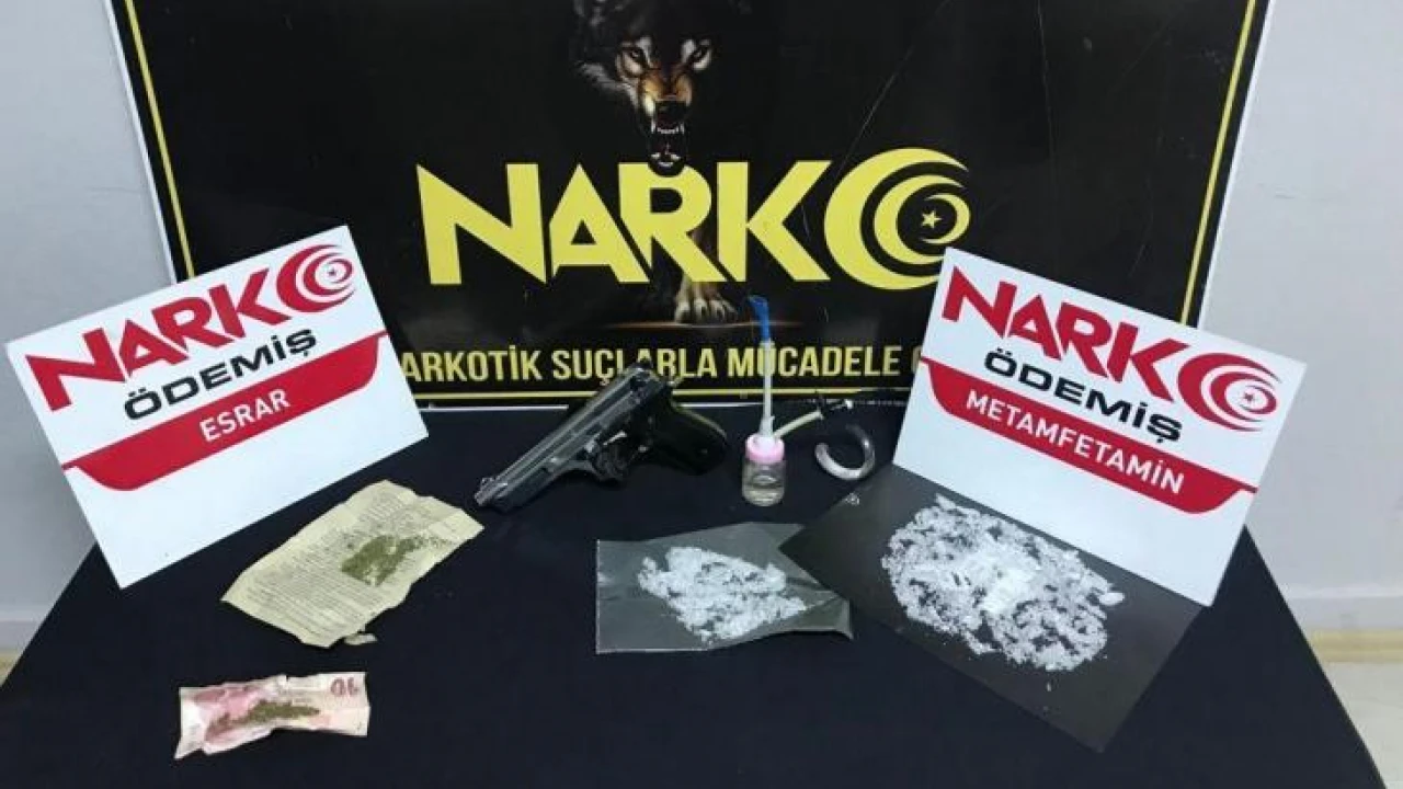 Polis ekiplerince adreste yapılan aramada sentetik ecza, esrar ve metamfetamin maddesinin yanı sıra hassas terazi de ele geçirildi.