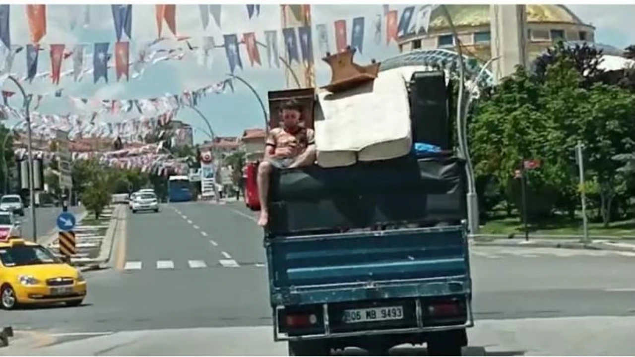 Ankara'da seyir halindeki kamyonetin eşya yüklü kasasında oturan bir vatandaş, hem kendi canını hem de trafik güvenliğini hiçe saydı. Normal bir yolculuk yapıyormuş gibi elindeki telefonla ilgilenen duyarsız şahsın rahat tavırları ise 'pes' dedirtti.